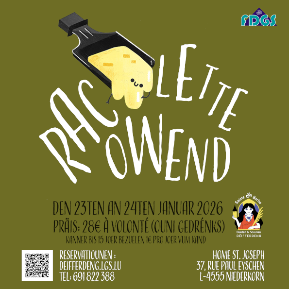 RakletteOwendAll Joer organiséiert FDGS e Raclette Owend. An engem gemittlechem Sall, bis elo ëmmer zu Nidderkuer am Home St. Joseph,(37, rue Paul Eyschen, L-4555) gëtt et Raclette mat gebootschten Gromperen a soss gutt Saachen à gogo. Duerno gëtt et Kaffi an Dessert. Fir Gedrénks ass natierlech och gesuergt. Nieft den traditionelle Softdrinks gëtt et assortéiert Wäiner vu wäiss iwwer Rosé op rout an zum Schluss eng Kirsch/Quetschendrëpp. Raclette Owend 2026 - Hei kritt Dir ganz sécher de KéisDatumOch dëst Joer proposéieren mer erëm zwee Deeg. An zwar: